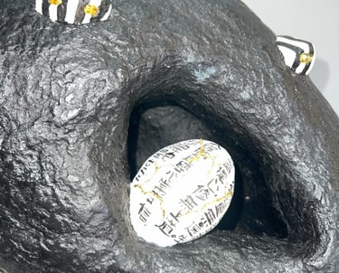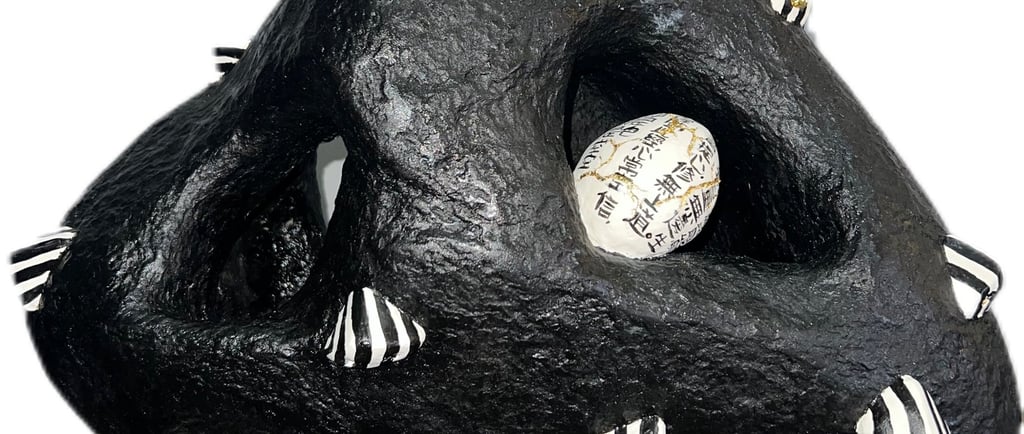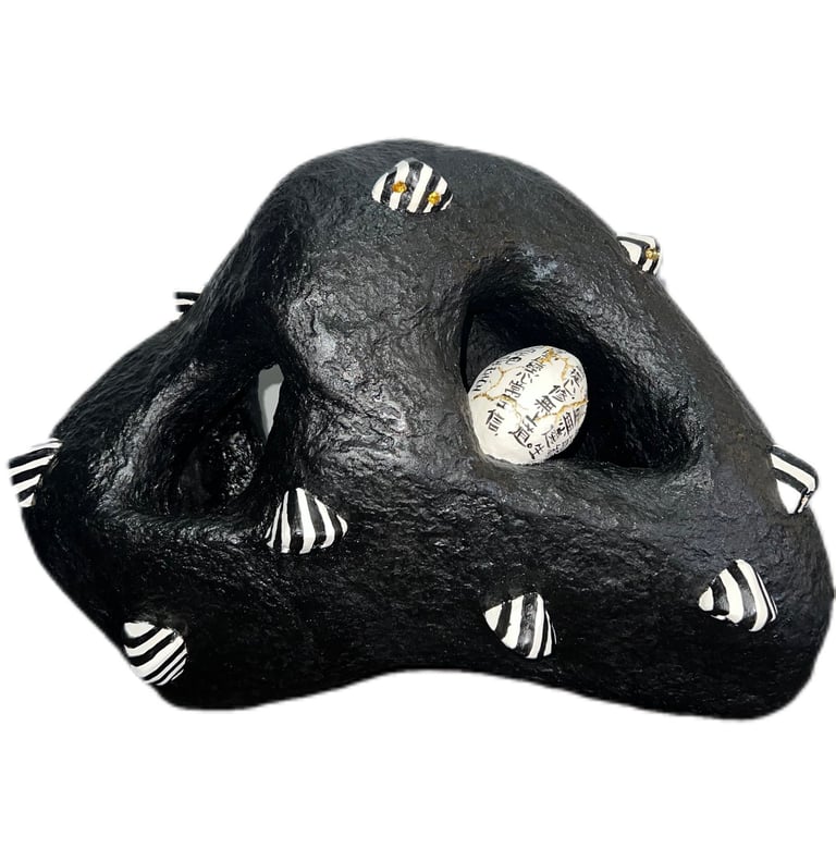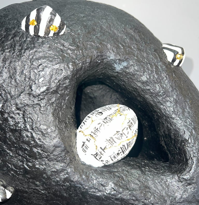 A focal point of the piece is its gleaming golden nostrils, which serve as a transformative gateway. Resting within this space is a large egg, an ancient and universal symbol of rebirth, creation, and untapped potential. Inscribed with Japanese sutras, the egg carries an air of sacred wisdom, whispering of impermanence and the continuous cycle of renewal.